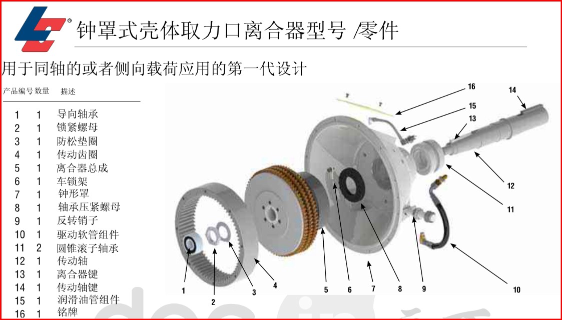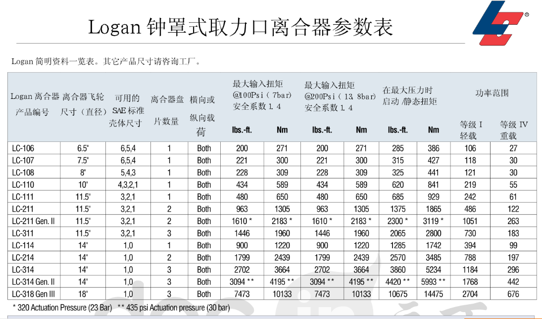 Logan氣/液驅(qū)動 鐘罩式殼體取力口離合器式自調(diào)節(jié)的,設(shè)計(jì)成直接安裝到柴油發(fā)動機(jī)或者汽油發(fā)動機(jī)的飛輪上。摩擦圓盤組為干式應(yīng)用設(shè)計(jì)。通過一個(gè)固定的缸套-活塞布置或者通過內(nèi)置軸和離合器油道來完成。離合器的傳動軸通過內(nèi)孔或鍵槽來安裝。扭矩從盤片組傳遞到安裝在發(fā)動機(jī)飛輪上的齒輪傳動齒圈上。Logan離合器主杠加壓, 推動活塞夾緊或鎖住摩擦片或分離鋼片。當(dāng)壓力移走, 回位彈簧使摩擦片和鋼片分離, 當(dāng)鋼片和摩擦片分離后, 可以保持運(yùn)行間隙。
